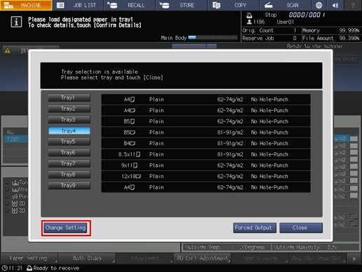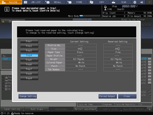 When the message for selecting a specific tray is displayed, change the paper settings (current settings) configured for that tray to the settings (reserved settings) required by the print data. Load the paper, which can be used in line with the changed paper settings, into the tray and then print.