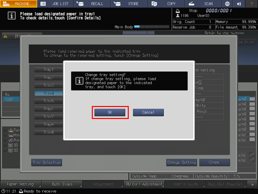 A screen requesting confirmation for changing the tray paper settings is displayed.