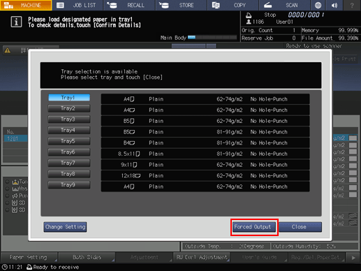 - The tray selected for forced output is used as a paper feed tray until that job ends.