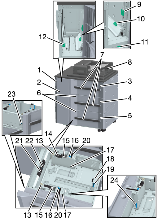 24 | Side guide lock release lever | When moving Side guides, press the lever on the back side to unlock. |