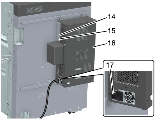 14 | Service port (USB 3.0 Type A e 2) | Used when connecting external memory media (USB memory, USB-HDD). Service port (USB 3.0 Type A e 2) supports low power devices only. Please provide an external supply of power for devices that require a large amount of power. |