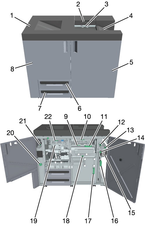 8 | Saddle stitcher left side door | Open this door when replenishing staples or clearing a paper jam. |