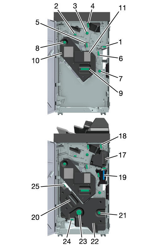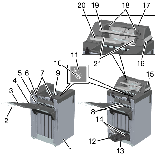 1 | Finisher front door | Open this door when replenishing a staple cartridge for staplers, or when clearing a paper jam. When the Punch Unit PK-525 is mounted, open this door to discard punch scraps. When the Saddle Stitcher SD-510 is mounted, open this door to replenish a staple cartridge for the stitcher, or clear a paper jam in the Saddle Stitcher. |