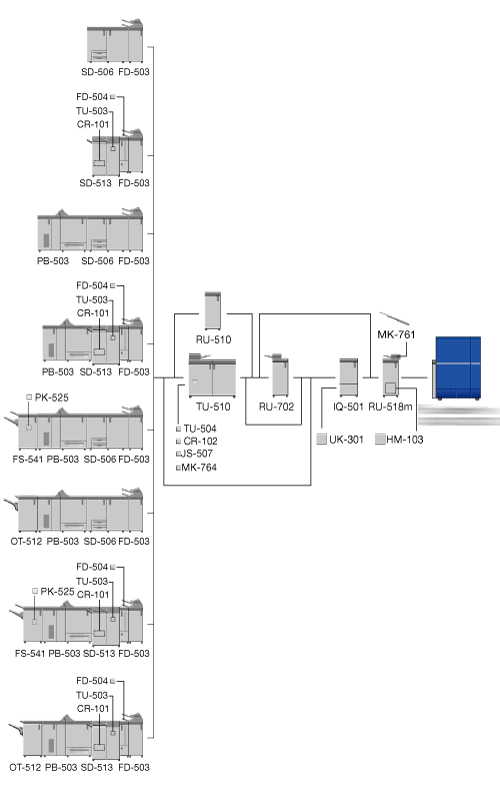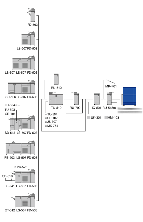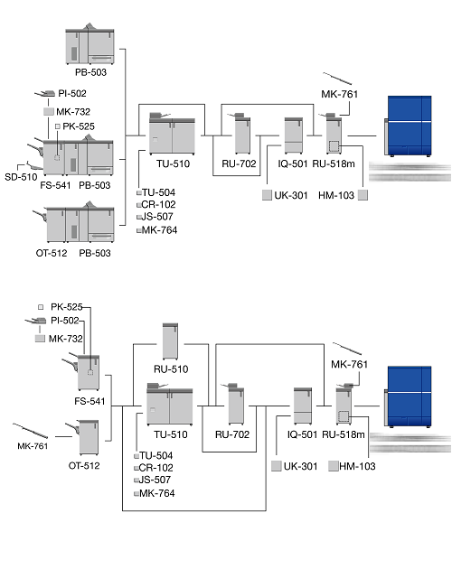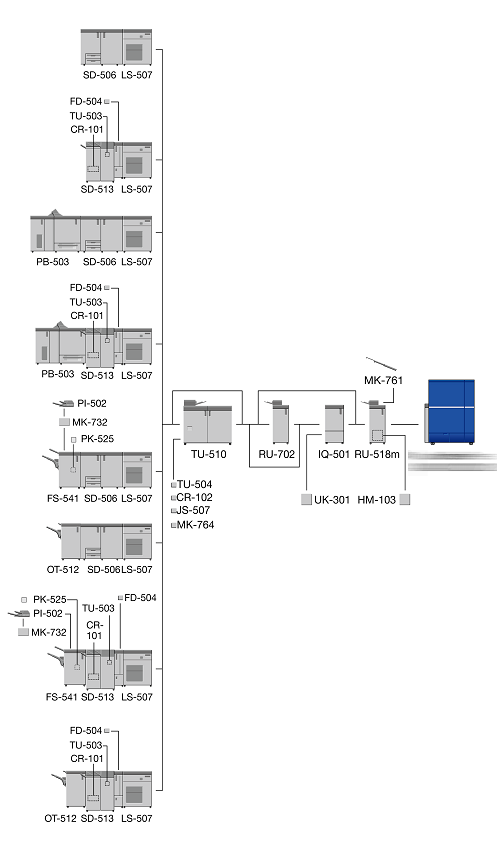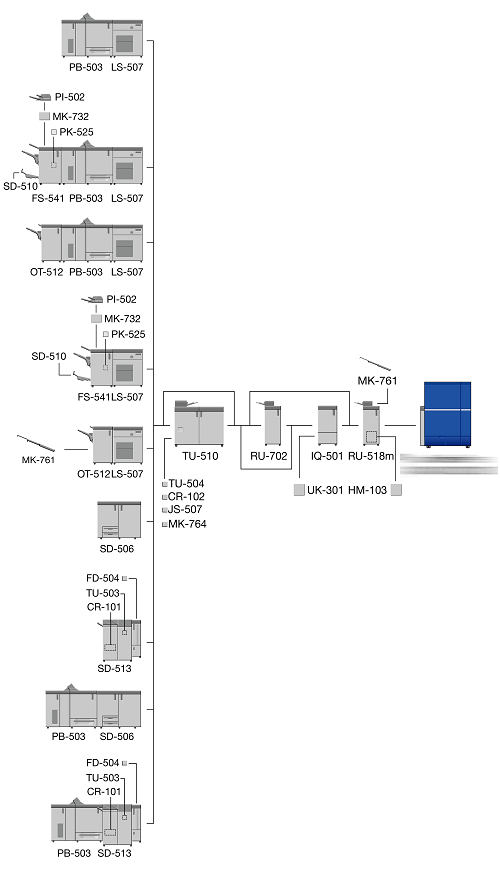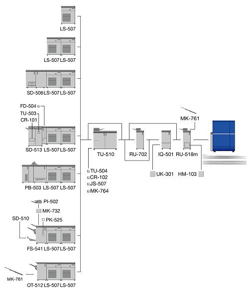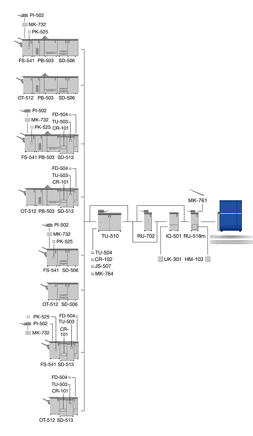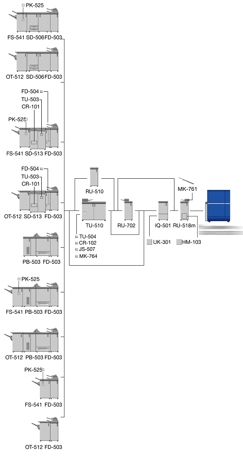 The optional devices marked with an asterisk "*" are only required when Finisher FS-541 with PostInserter PI-502 is mounted directly below.