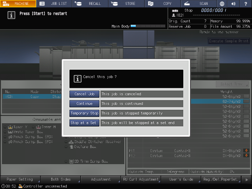 [Stop at a Set]: The job will be stopped at a set end. To restart printing, press Start on the Control panel. [Stop at a Set] is displayed when Image Controller IC-610 is mounted.