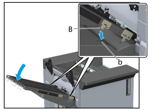 Lower the position of the Main tray when attaching or detaching Banner Output Tray Unit MK-761 to or from the Output Tray OT-512.