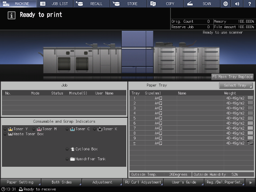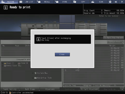 Setting items | [FS Main Tray Replace] | The dialog box is displayed, and the Main tray lowers (approximately 5 cm / 1.97"). | |