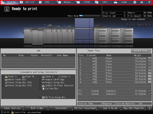 The Print Manager screen of [CNTL] allows you to operate Print Manager from the Touch panel. You can check the status of this system or manage print jobs.