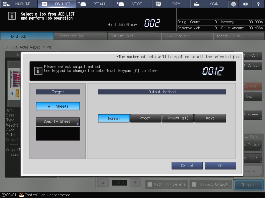 Touch panel - [MACHINE] - [JOB LIST] - [Hold Job] - [Output]