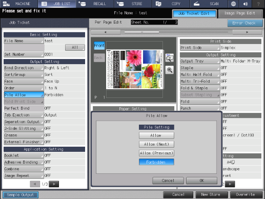 Touch panel - [MACHINE] - [JOB LIST] - [Hold Job] - [Job Ticket] - [Job Ticket Edit] - [Pile Allow]