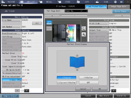 Touch panel - [MACHINE] - [JOB LIST] - [Hold Job] - [Page Edit] - [Job Ticket Edit] - [Crease (PB)]