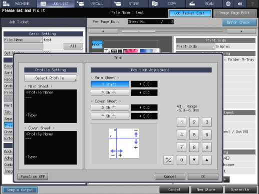 Touch panel - [MACHINE] - [JOB LIST] - [Hold Job] - [Job Ticket] - [Job Ticket Edit] - [Trim]