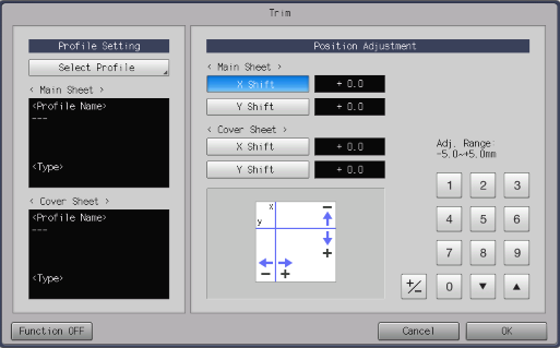 Setting items | [Select Profile] | Manages the trimmer profile to set to the [< Main Sheet >] and the cover sheet [< Cover Sheet >]. | |