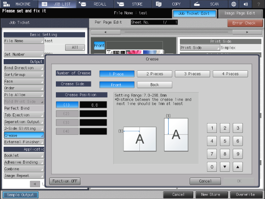Touch panel - [MACHINE] - [JOB LIST] - [Hold Job] - [Job Ticket] - [Job Ticket Edit] - [Crease]