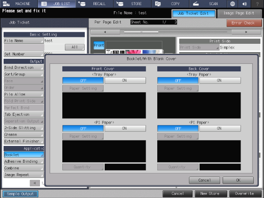 Touch panel - [MACHINE] - [JOB LIST] - [Hold Job] - [Page Edit] - [Job Ticket Edit] - [Booklet] - [With Cover]