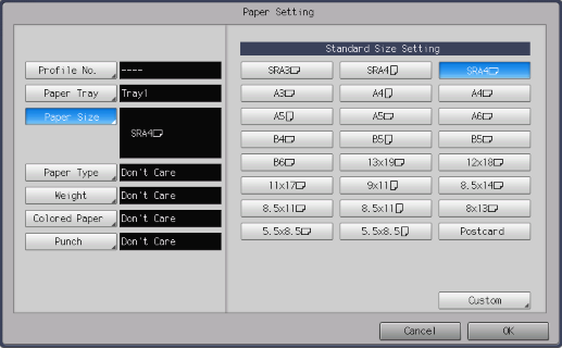 To use the custom size registered in this system, press [Size Recall]. For details, refer to [Custom Size Setting].