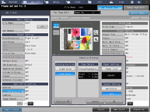 Touch panel - [MACHINE] - [JOB LIST] - [Hold Job] - [Page Edit] - [Job Ticket Edit] - [Adhesive Binding]