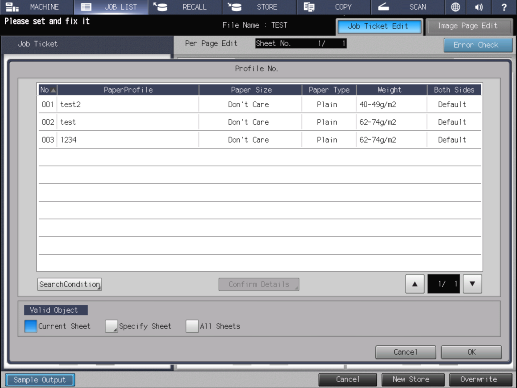 Touch panel - [MACHINE] - [JOB LIST] - [Hold Job] - [Job Ticket] - [Job Ticket Edit] - [Profile No.]