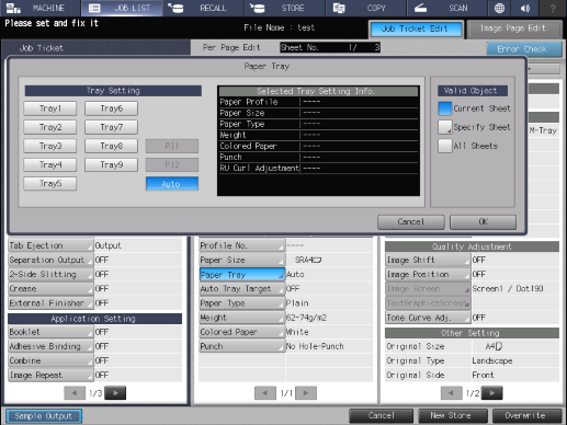 Touch panel - [MACHINE] - [JOB LIST] - [Hold Job] - [Job Ticket] - [Job Ticket Edit] - [Paper Tray]