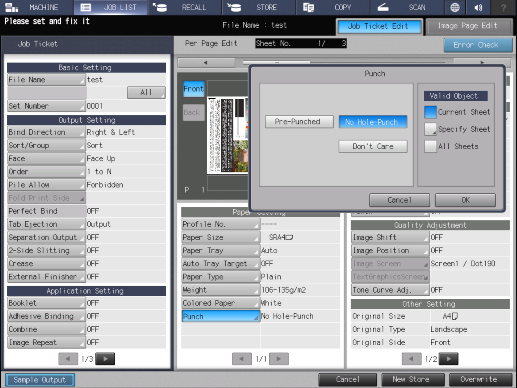 Touch panel - [MACHINE] - [JOB LIST] - [Hold Job] - [Job Ticket] - [Job Ticket Edit] - [Punch]