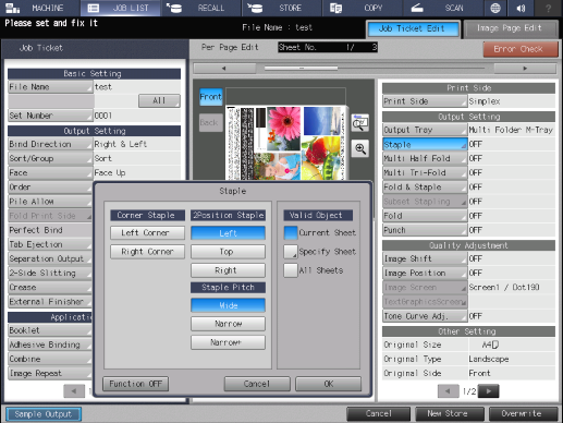 Touch panel - [MACHINE] - [JOB LIST] - [Hold Job] - [Job Ticket] - [Job Ticket Edit] - [Staple]