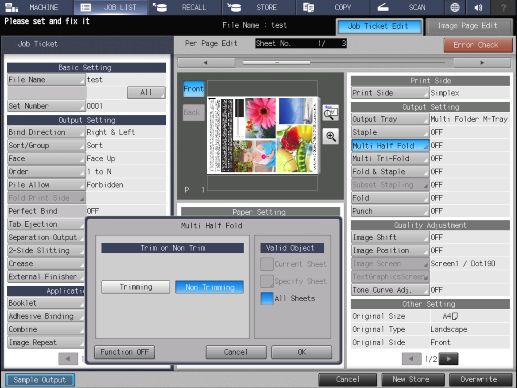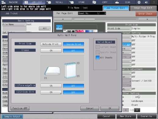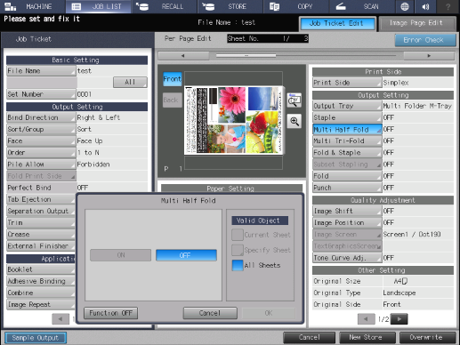 Touch panel - [MACHINE] - [JOB LIST] - [Hold Job] - [Page Edit] - [Job Ticket Edit] - [Multi Half Fold]