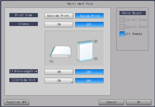 Setting items | [ON] | Slits both edges of paper. [Slitting] and [Offset against Cover] are available. | |