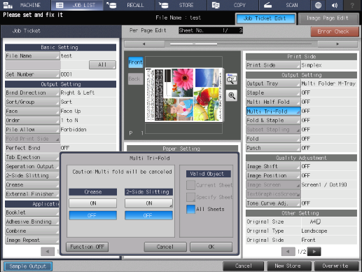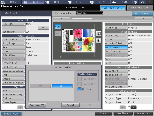 Touch panel - [MACHINE] - [JOB LIST] - [Hold Job] - [Page Edit] - [Job Ticket Edit] - [Multi Tri-Fold]