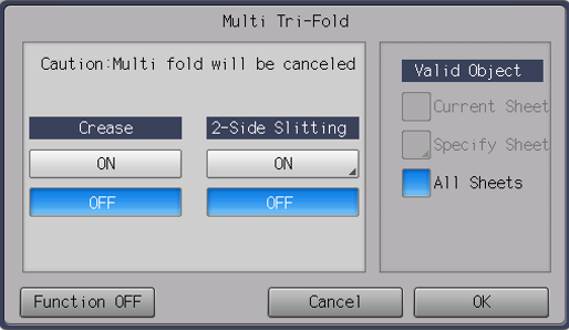 Setting items | [ON] | Slits both edges of paper. [Slitting] and [Offset against Cover] are available. | |