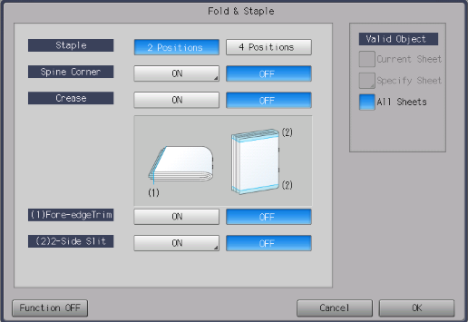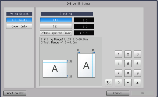 Setting items | [ON] | Slits both edges of paper. [Slitting] and [Offset against Cover] are available. | |
