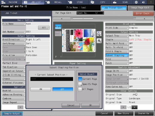 Touch panel - [MACHINE] - [JOB LIST] - [Hold Job] - [Page Edit] - [Job Ticket Edit] - [Subset Stapling]