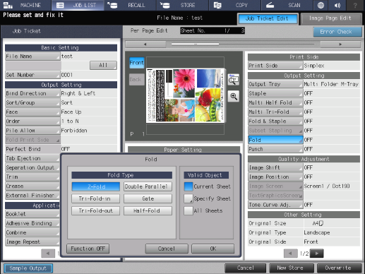 Touch panel - [MACHINE] - [JOB LIST] - [Hold Job] - [Job Ticket] - [Job Ticket Edit] - [Fold]