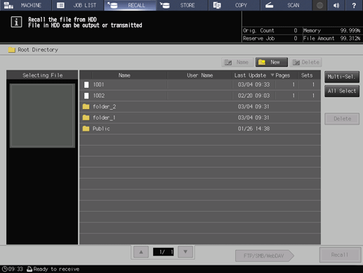 [All Select] | Selects all of the HDD store jobs. Press [Multi-Sel.] to release [All Select]. Folders or boxes cannot be selected. | ||