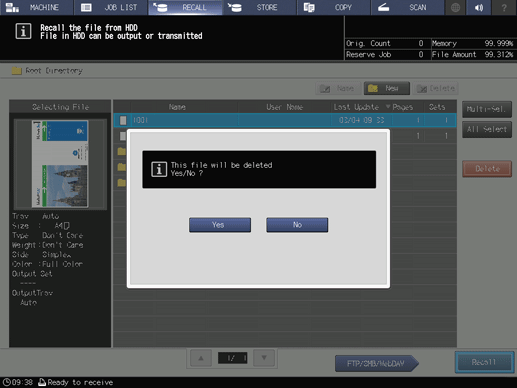 [Recall] | Recalls an HDD store job. There are 3 methods to recall a job. For details, refer to [Recall]. | ||
