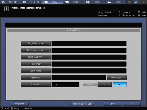 Touch panel - [RECALL] - Select 1 HDD store job - [FTP/SMB/WebDAV] - [FTP] - [Input Address]