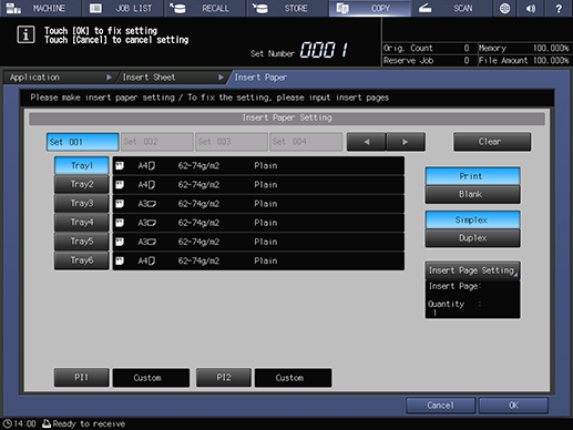 Touch panel - [COPY] - [Application] - [Insert Sheet] - [Insert Paper Setting] for [Change Set]