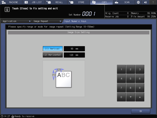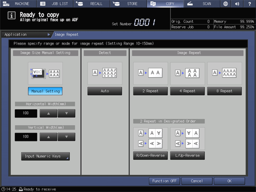 Screen access | Touch panel - [COPY] - [Application] - [Image Repeat] | ||