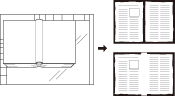 When a thick original such as a book is scanned using the Original glass, black copy marks may be produced along the borders or center lines. Selecting [FrameCenterErase] sets the position and width of black copy marks, and erases them.