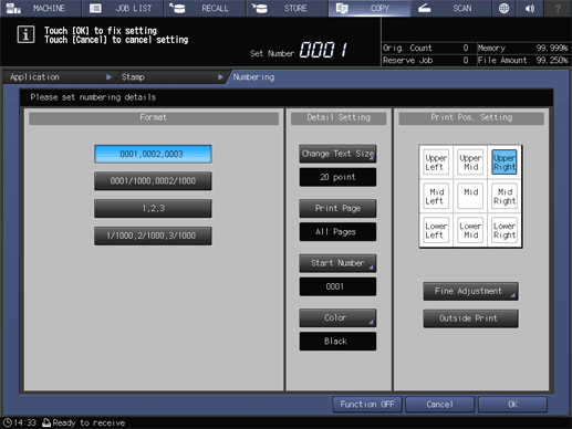 Touch panel - [COPY] - [Application] - [Stamp] - [Set Numbering]
