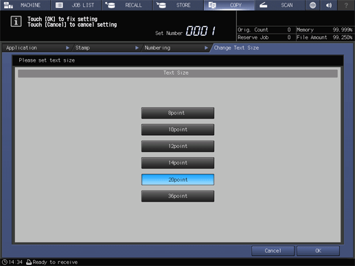 Setting items | [Change Text Size] | Selects the text size for printing. Setting value: [8point] / [10point] / [12point] / [14point] / -[20point] / [36point] | |