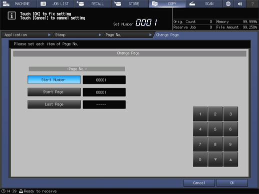 Set the start number, start page, and end page of the page stamp.