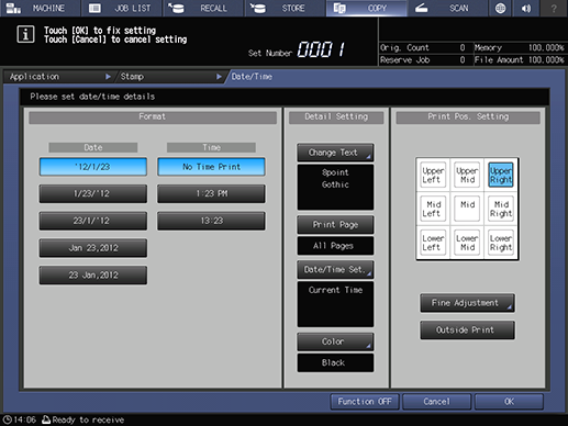 Touch panel - [COPY] - [Application] - [Stamp] - [Date/Time]