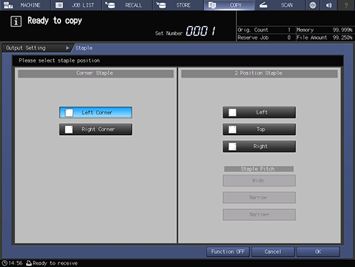 Touch panel - [COPY] - [Output Setting] - [Staple]
