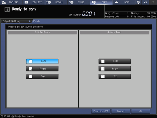 Touch panel - [COPY] - [Output Setting] - [Punch]