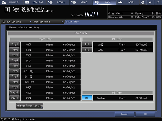 Screen access | Touch panel - [COPY] - [Output Setting] - [Perfect Bind] - [Cover Tray] | ||