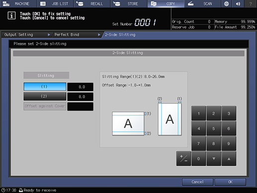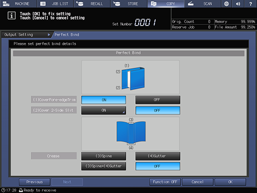 Screen access | Touch panel - [COPY] - [Output Setting] - [Perfect Bind] | ||