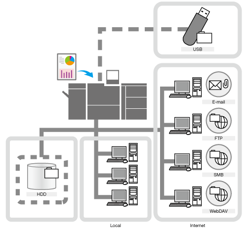 - Upload scanned data to the FTP server, SMB server, or WebDAV server