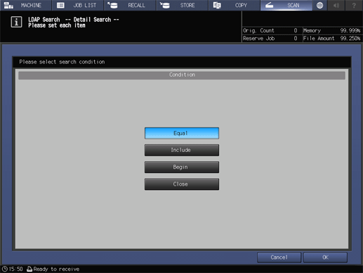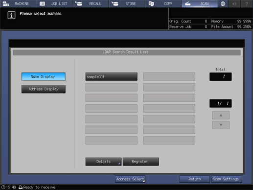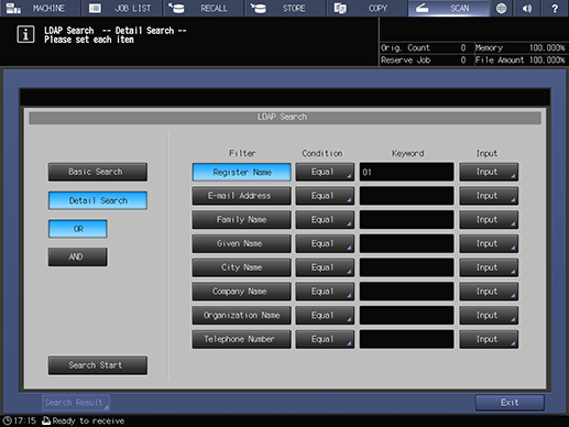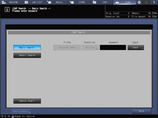 Screen access | Touch panel - [SCAN] - [E-mail] - [Search] - [LDAP Search] | ||