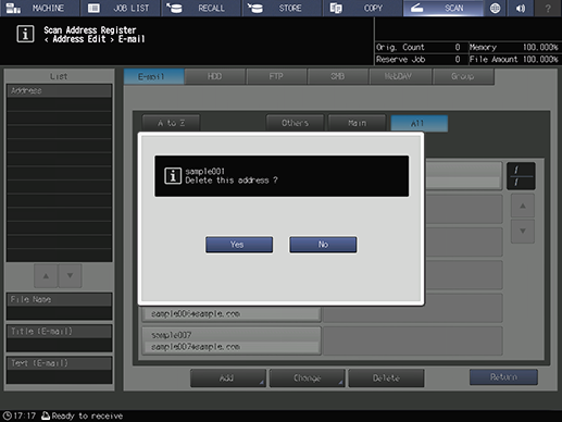 Touch panel - [SCAN] - [HDD] - [Register/Edit] - Select an address. - [Delete]