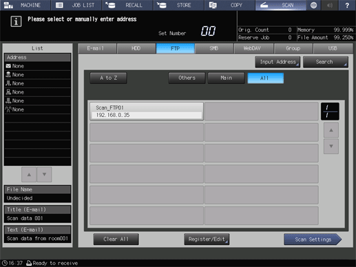 Screen access | Touch panel - [SCAN] - [FTP] | ||